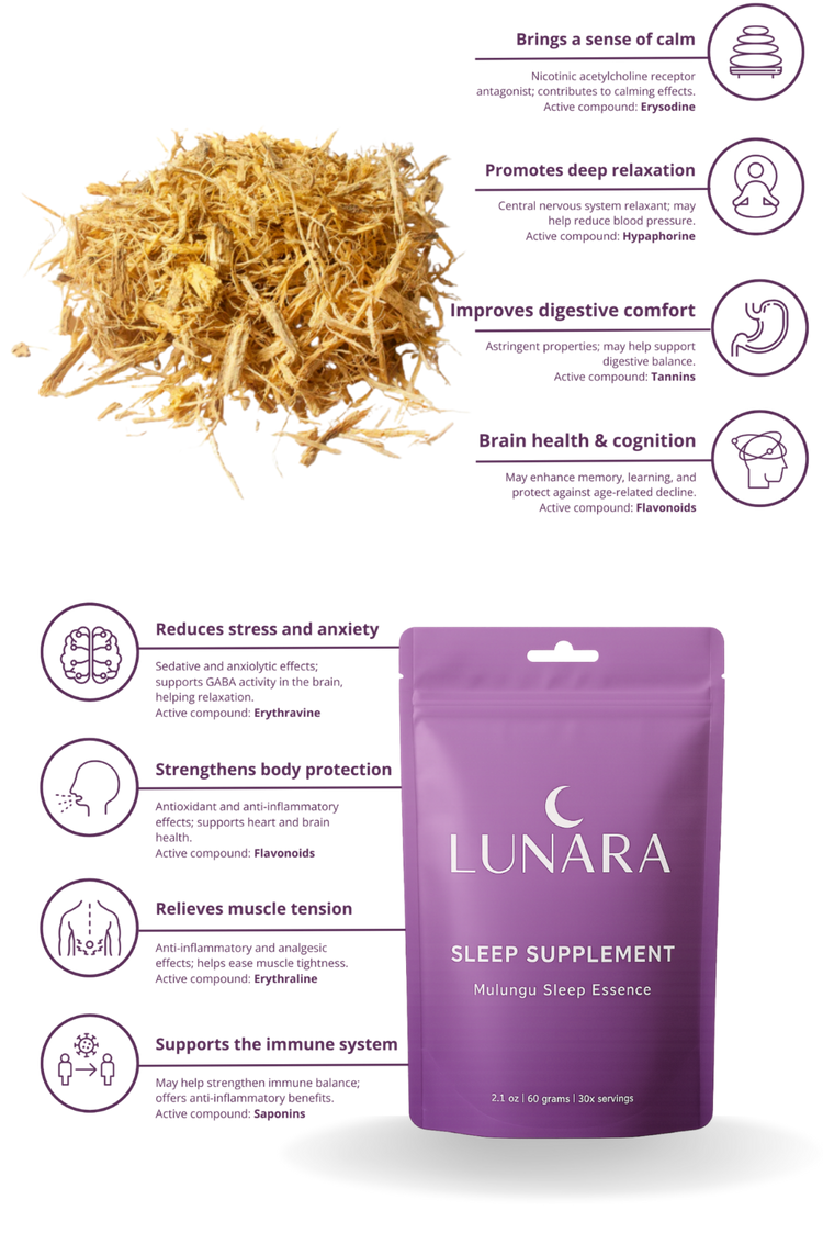 Lunara is a natural sleep supplement made with Erythrina mulungu, a traditional Brazilian botanical known for its calming properties.